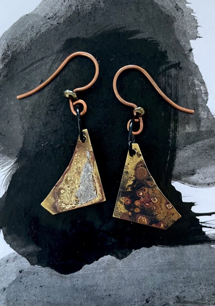 Super lightweight double sided brass earrings with aluminium fleck. Note: copper hooks (not suitable for people sensitive to copper) 25mm H x 17mm W
