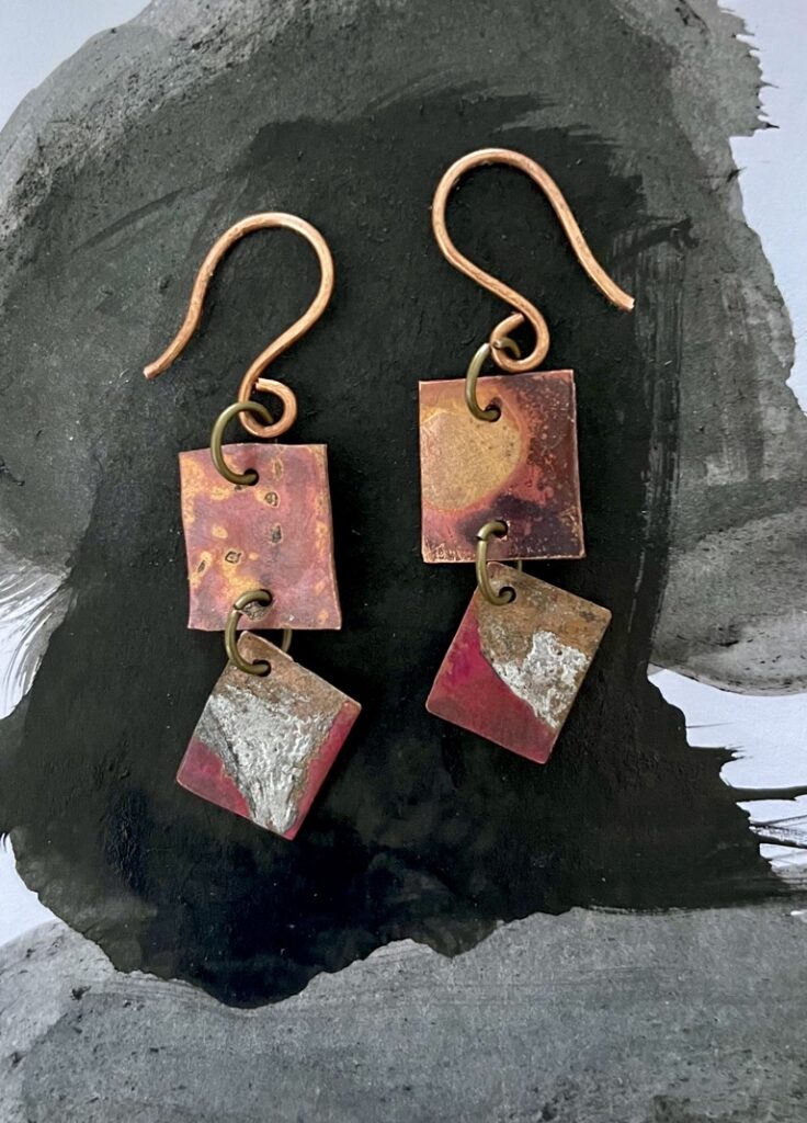 Super light weight copper and aluminium double sided earrings. Note: copper hooks (not suitable for people sensitive to copper) 30mm H x 12mm W